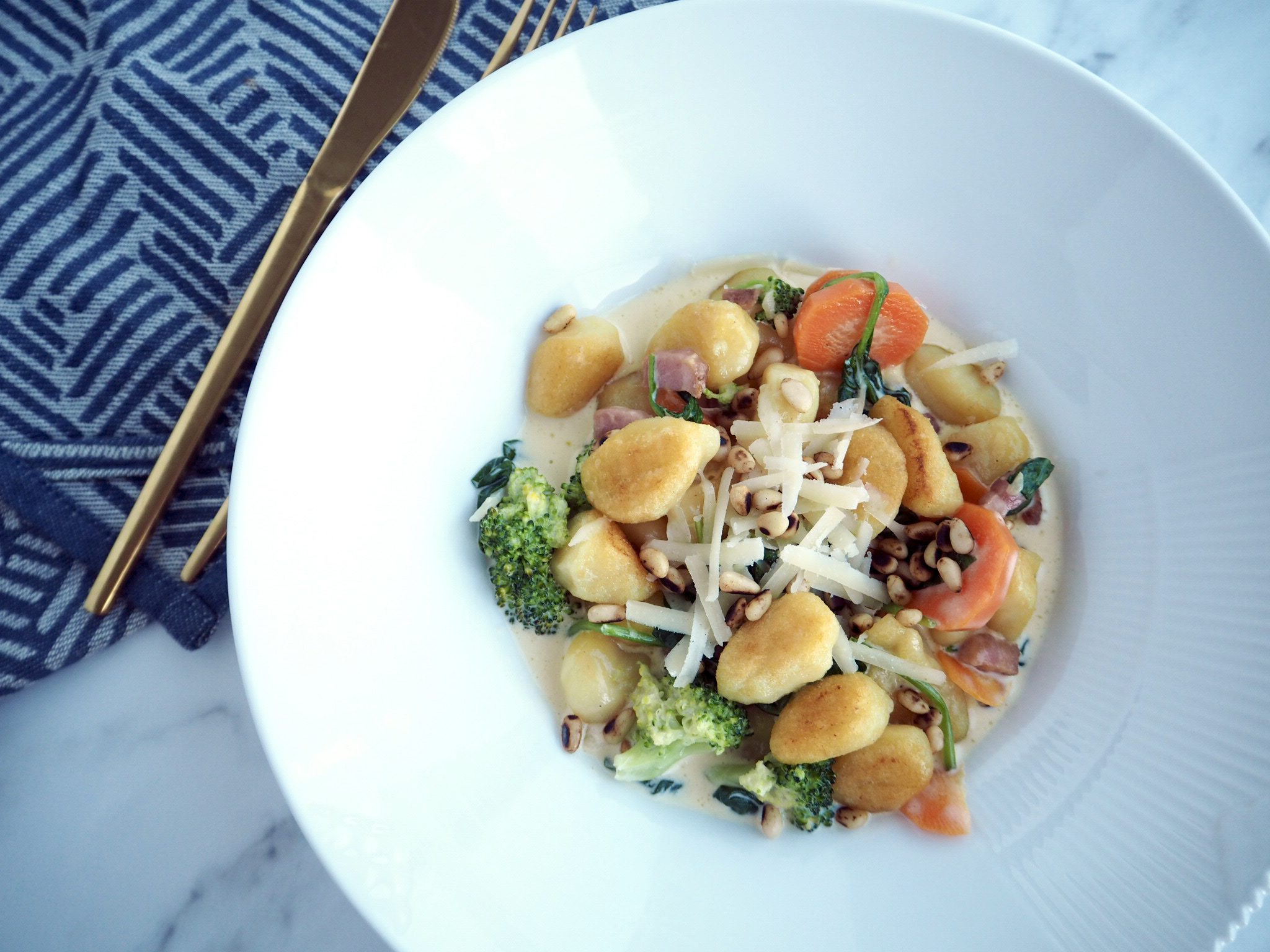 Glutenfri gnocchi med grønt, pinjekerner og parmesan